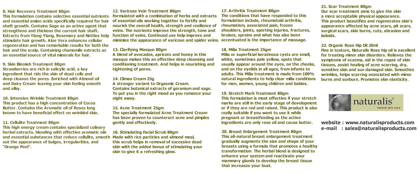 Naturalis Herbal Treatment range are extracts of naturally occuring herbs in a strict mathematical formula which confirms the synergy that acts amongst the herbs. It is a wonderful assortment of 400 odd naturally ocurring chemical entities which is receptive to having any one of its beneficial actions upon any specific physiological and anatomical process, magnified by the addition of other beneficial herbs